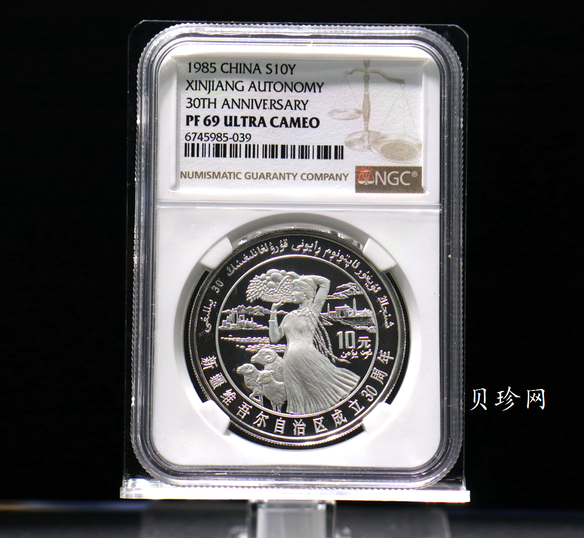 1985年是新疆维吾尔自治区成立30周年,为纪念这个特殊的历史事件,展现新疆维吾尔自治区成立后取得的历史成就,中国人民银行于1985年10月1日发行新疆维吾尔自治区成立30周年1盎司圆形银质纪念币一枚。该枚纪念币正面图案为乌鲁木齐新疆人民大会堂、上方背景图案为天山,下方铸有祥纹,并刊国名、年号,背面图案为丰收图,背景为草原、羊群、民居、现代化工业厂区,并刊有面额。