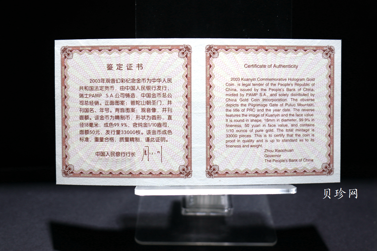 • 【031001】2003年观音纪念币-观音像1/10盎司圆形幻彩精制金币