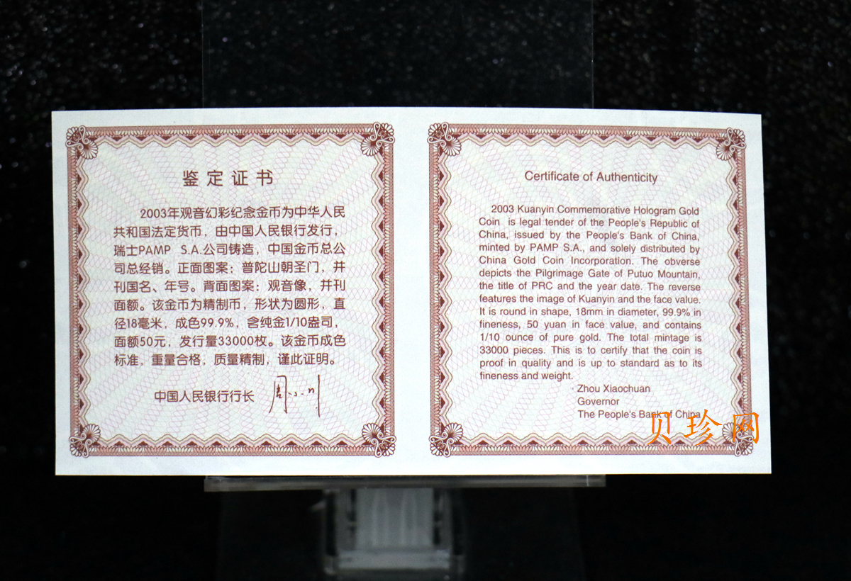 • 【031001】2003年观音纪念币-观音像1/10盎司圆形幻彩精制金币
