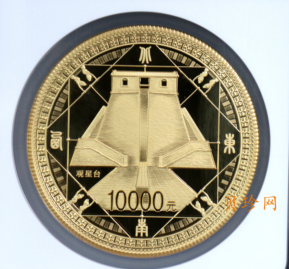 其正面为中华人民共和国国徽,并刊国名、年号。背面图案为观星台建筑造型,配以中国古代建筑斗拱、方位图及观星台建筑装饰图案等组合设计,并刊“观星台”中文字样及面额。面额为10000元,99.9%纯金,最大发行量为200枚。