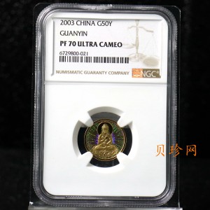 中国现代贵金属币“观音”选题系列,“观音像”图稿表现的是最为朴实的法相:衣着没有任何讲究,上身赤裸,两臂佩有精制臂环。头戴宝冠,宝冠正中为化佛。“观音”偏向于男身,两耳长垂,双目微闭。宝冠后缀披帛,披帛轻盈而接近透明,从脑后缀下来,斜披于肩后,最终下落至莲座两侧。这无疑来自中国,来自中国民间,来自中国民间最偏远的山区。