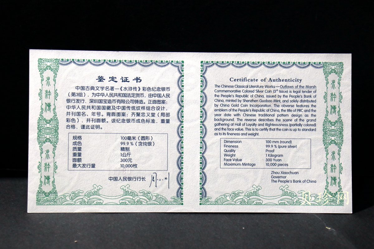 单币:2011年中国古典文学名著《水浒传》第(3)组-忠义堂1公斤精制彩银币