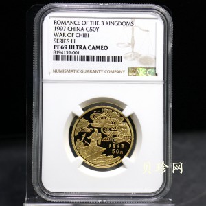 历史文化,金币传承。中国人民银行于1997年发行了中国古典文学名著《三国演义》金银纪念币(第3组)一套,该套纪念币共4枚,其中金币2枚,银币5枚,由上海造币厂铸造,中国金币总公司经销。