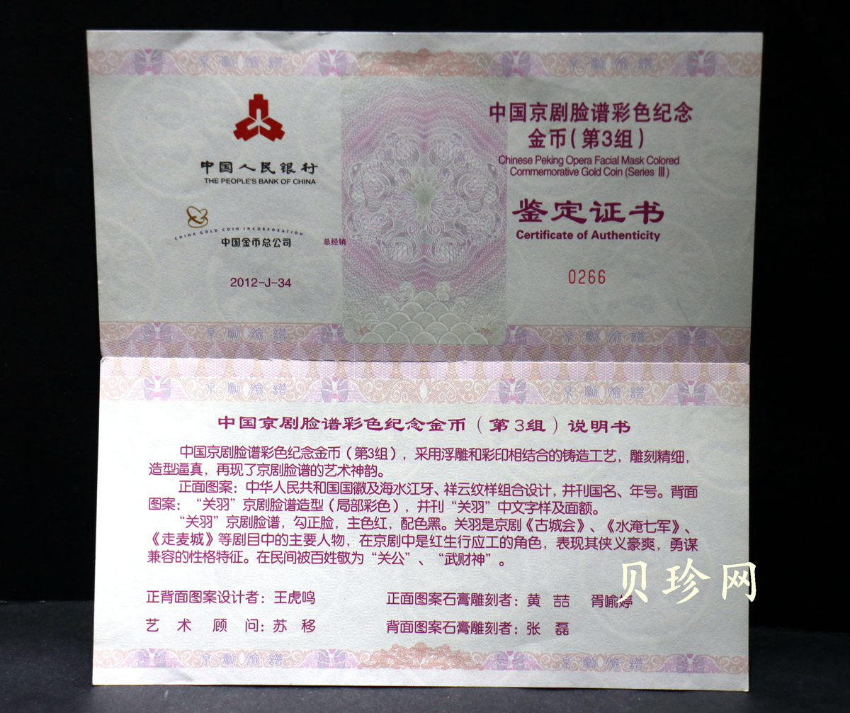 单币:2012年京剧脸谱第(3)组-关羽5盎司精制彩金币