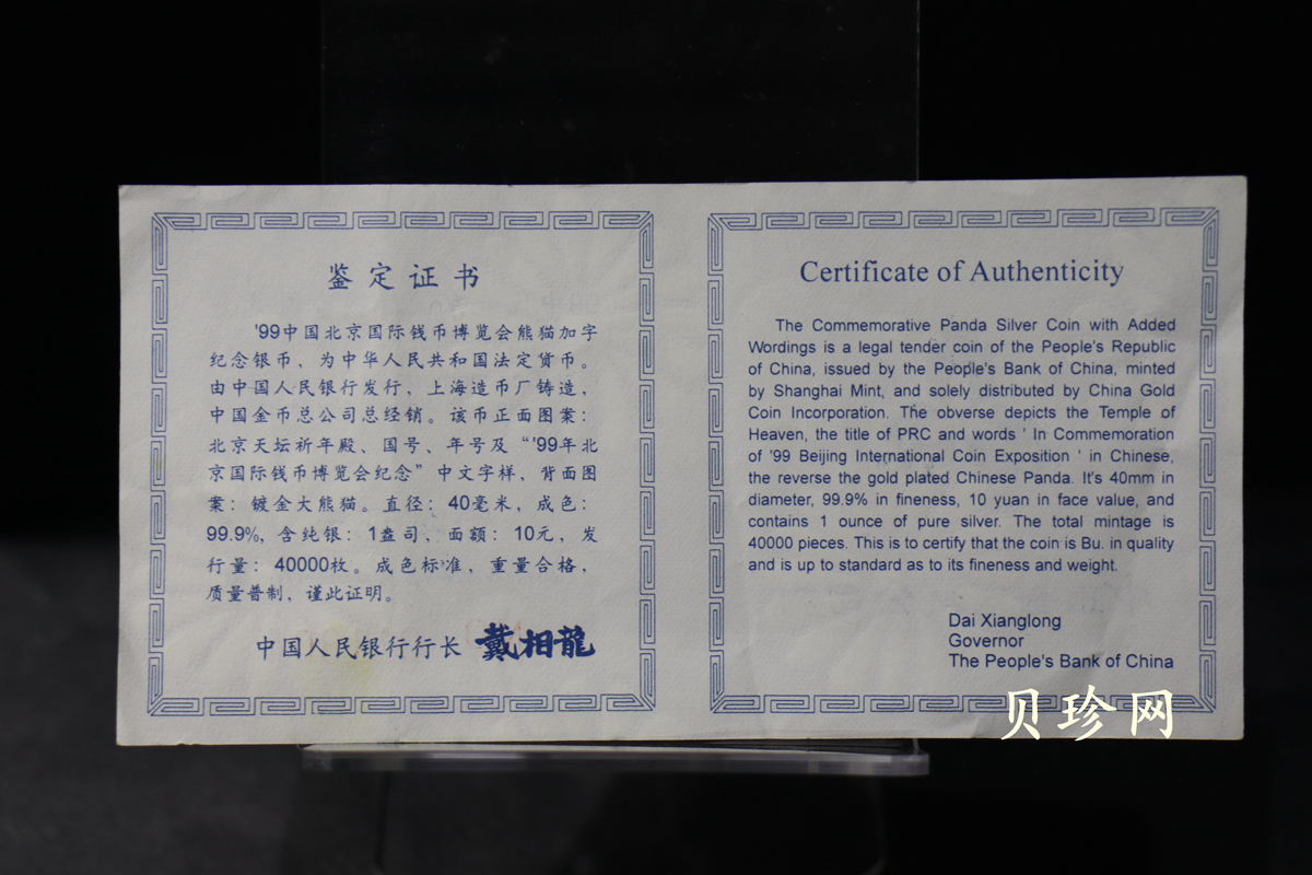 此外,“1999北京国际钱币博览会”纪念银币采用了大熊猫银镀金工艺,凸显了大熊猫的形象。币面环铸银币成色、材质和重量,并铸面额。