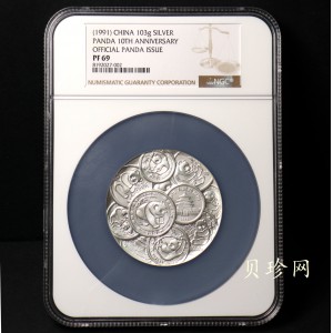 • 【911112】1991年熊猫金币发行十周年3.3两纪念银章