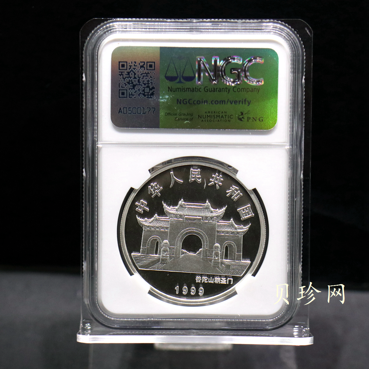 “观音”系列金银币起自1993年,最早正面图案为长城,后改为普陀山海岸牌坊。1999年做大调整,镀金银币单独用普陀山朝圣门。
