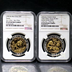 套币:1990年熊猫1/4+1/8盎司精制双金属币+章
