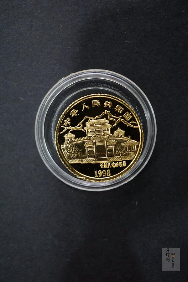 胡福庆以“八达岭楼景”为币面主题,但“楼景”又不是某座建筑的特指,而是把相关的不同风格、不同功用的建筑,集中到一起进行展示。具体构图,画面又分三个层次:前,四柱三门石碑坊,两侧缀以青树;牌坊之右,为六角翘檐木亭;后,作为背景,“八达岭”只是一种虚化的描述,浮于城楼后的半空,淡淡的几笔,如飘荡于天际的流云,也如飞翔于天际的群鸟。居于其中的城墙与城楼,才是整个币面的核心。城墙为一道弧线,如彩虹横居。其上雉堞凸凹,岁月起伏,流溢出历史的沧桑和人文的厚重。