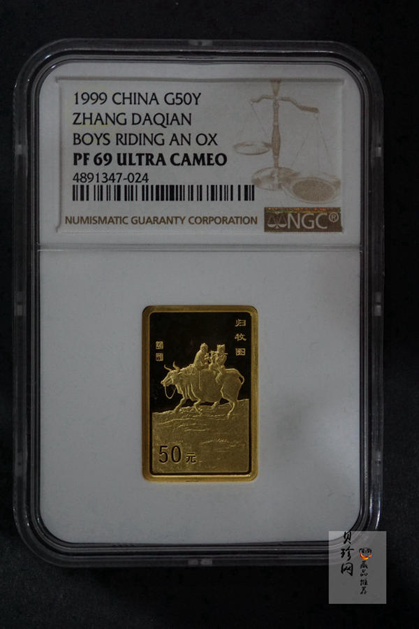 单币:1999年中国近代国画大师张大千金银纪念币-归牧图1/2盎司长方形精制金币