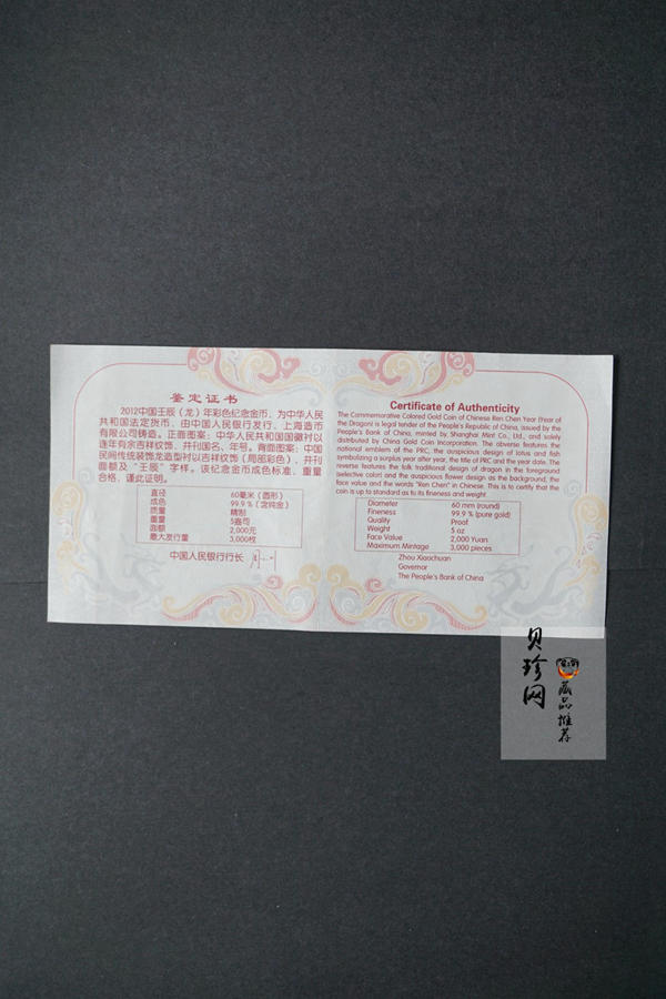 单币:2012年壬辰龙年生肖5盎司精制彩金币