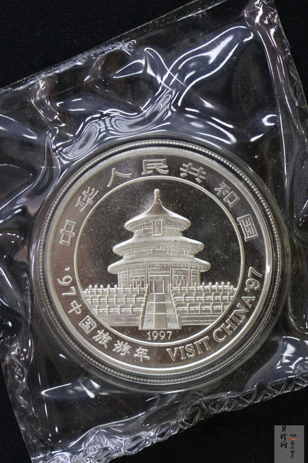 中国人民银行发行“中国旅游年”纪念银币,为“熊猫”加字系列之一。加字母体为1997版“熊猫”1盎司普制银币。背面图案雕刻为沈阳造币厂谷英斌。正面图案沿用孙奇龄设计的“北京天坛祈年殿”图稿,外环分上下两个区域,上为“中华人民共和国”国名,下又分左右,左为中文“97中国旅游年”,右为英文“VISIT CHINA 97”。设计为沈阳造币厂张文竞。