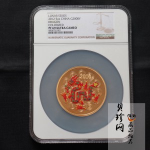 “中国民间传统装饰龙”的设计成功之处,在于注重民间语言的表述,也在于注重装饰效果的呈现。具体创作有准确把握两个核心,一是线条的稚拙运用,一是色调的夸张描绘。其中线条的稚拙运用,重要体现于“中国民间传统装饰龙”造型,演绎于民间剪纸艺术,但在最大限度保留剪纸元素的基础上,又有适应贵金属币彩色印制工艺的变异与突破。“龙”取行云之动态,躯体随币的圆形扭为“W”形,首尾以及四爪分不同方向上翘。缀于龙体的纹饰看似杂乱,实则规则而有序。不同部位、不同线条的运用,稚,有一种练达;拙,有一种刚烈。两者糅合,恰到好处。色调的夸张描绘,则有意识追求戏剧脸谱化的效果。色彩之“彩”红为主,绘于龙身,作底色。龙的躯体及四爪,同样以祥云纹饰勾画,但所用色彩,前者以蓝与绿为主,后者主要为黄色。龙首的眼与鼻,则是黑色点缀,颇有画龙点睛之神采。稚拙线条与夸张线条相互映衬,相互补充,最终烘托出民俗氛围的祥瑞与喜庆。