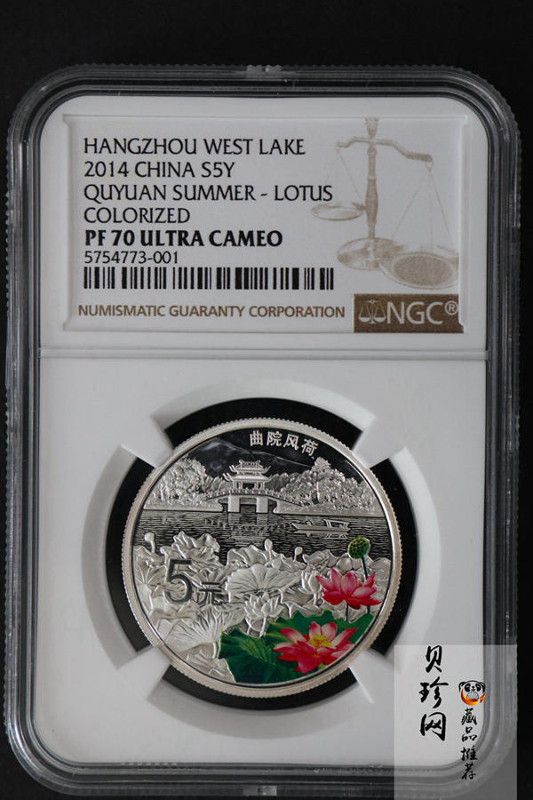 彩色移印工艺调绘的荷花艳色含羞,莲叶重重,与主景的本色雕刻荷花各有风情,显示出不同意境的美。欣赏这枚银币,观者如在荷中行,人在花丛,花映人面,花人两相恋。