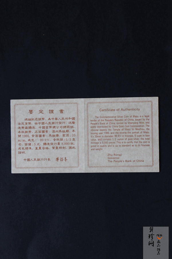 【950802】1995年妈祖-妈祖头像1/2盎司精制银币