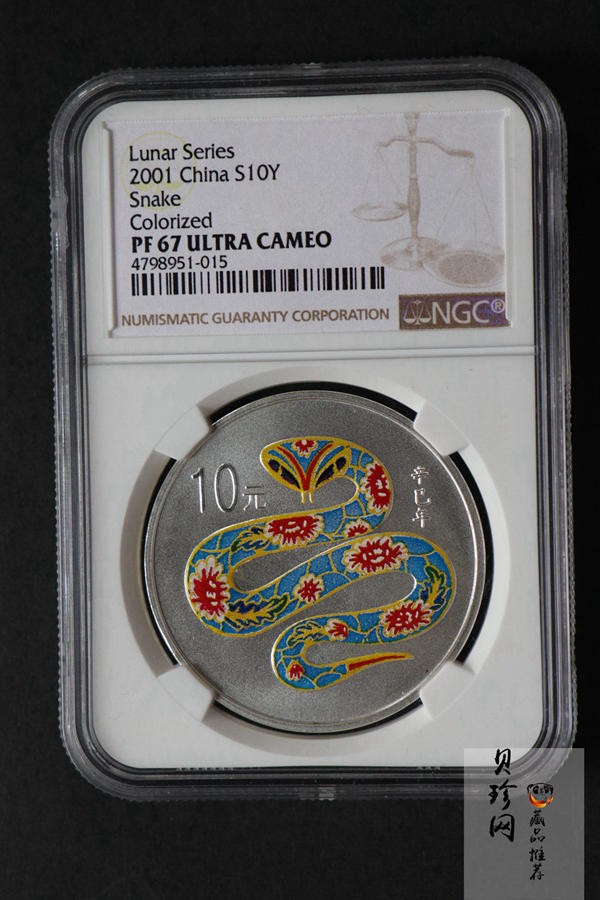【010208】2001中国辛巳(蛇)年金银纪念币-彩蛇图1盎司彩色精制银币