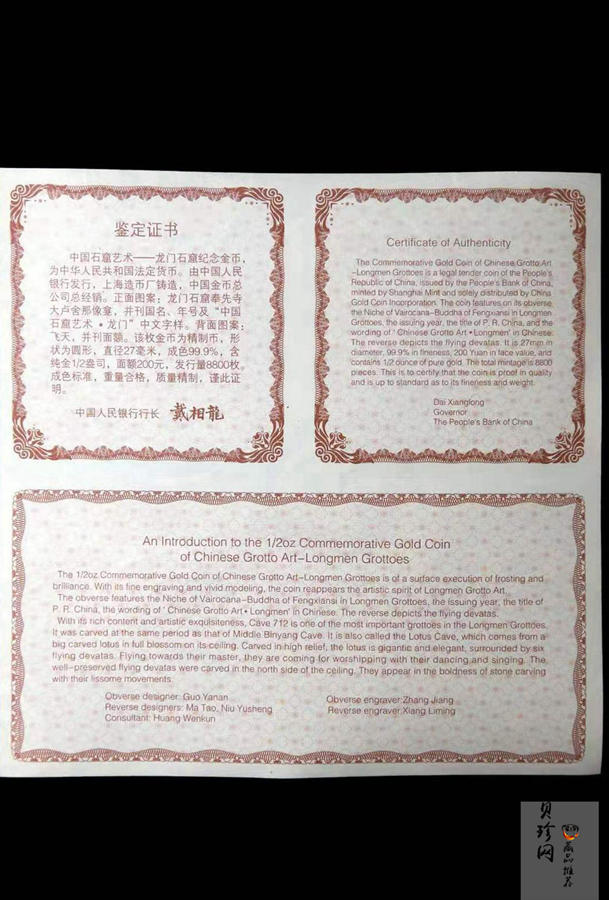 【020502】2002年中国石窟艺术(龙门)金银纪念币-飞天图1/2盎司精制金币