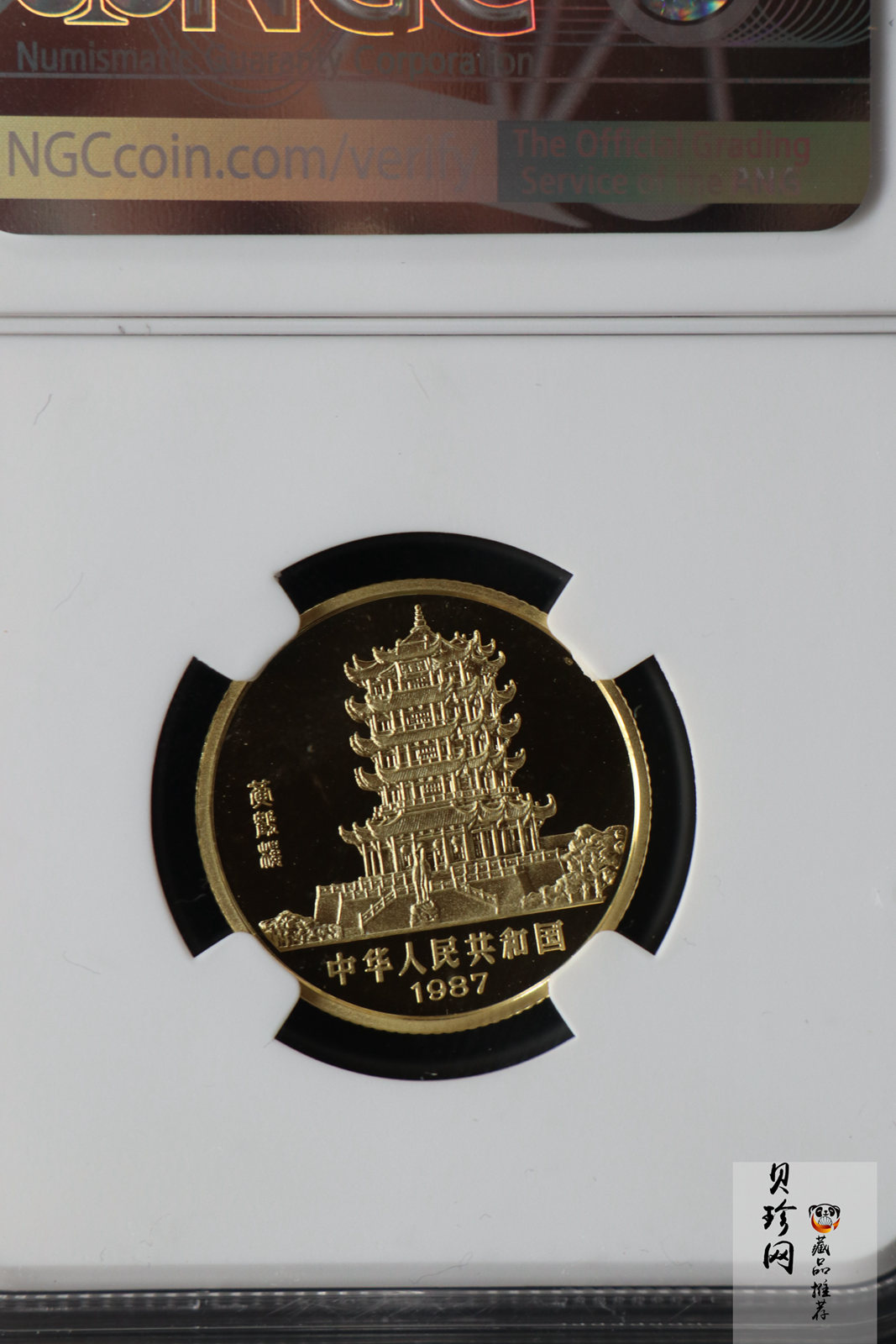 1987年之前,生肖系列金银币的正面图案都是以北京名胜古迹为主图。1987“中国丁卯(兔)年”金银纪念币打破了这种格局,北京城之外的景观,首次与生肖选题有了亲密接触。而这处能与北京名胜一比高低的建筑,就是湖北武汉的黄鹤楼。事实上,黄鹤楼出名也远早于京城的名胜,唐代诗人崔颢一句“昔人已乘黄鹤去,此地空余黄鹤楼”,前后传唱了1300余年。黄鹤楼原址武昌蛇山晃鹄矶头,相传始建于223年。历史上黄鹤楼屡建屡毁,最后一次被毁是1884年。